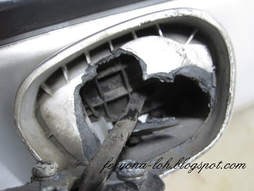 Malaysian can magically and amazingly create 6 extra lanes for 3-lane highway. Right after the Sg. Besi toll there was a massive traffic jam. It was a shocking 9 lines of car squeezing into 3 lane. My lane and the lane on my right hand side is combining to a lane entering the highway slowly (it was slow moving). Suddenly I saw something from the corner of my right eye. Blardy hell I yelled. There was a car which was about to kiss my car from the side! Before I knew it my right side mirror was pushed to the opposite side and broke off from my car body with me watching helplessly.